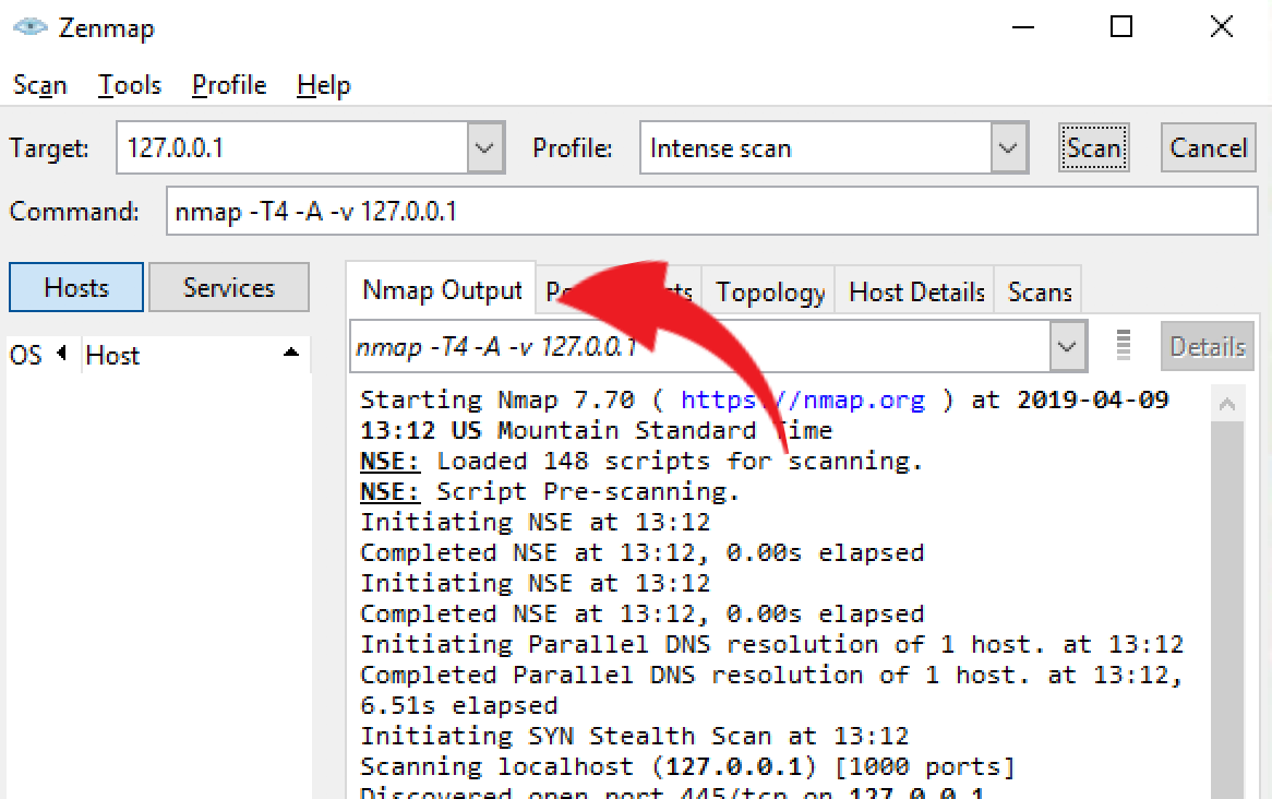 5. Nmap will now do its thing and scan the selected IP address’s ports, services and known devices. You’ll see lines upon lines of commands on the output tab but don’t be intimidated. Just wait for it to finish.